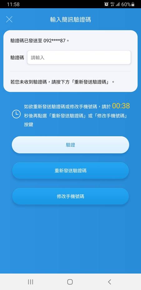 - 在APP上填列國籍、手機門號、姓名及身分證字號,若非目前使用之手機門號所有者、預付卡、特殊資費方案或門號無行動上網功能等,於「輸入的身分證號碼與手機門號申請人為同一個人」選擇「否」,並輸入帳號(自設)、密碼(自設)及電子信箱,上傳身分證正反面照片(清晰照片),影像辨識確認無誤,將發送簡訊驗證碼至欲註冊手機門號,於驗證碼欄位輸入驗證碼,審核完成(約3個工作日)即完成註冊。