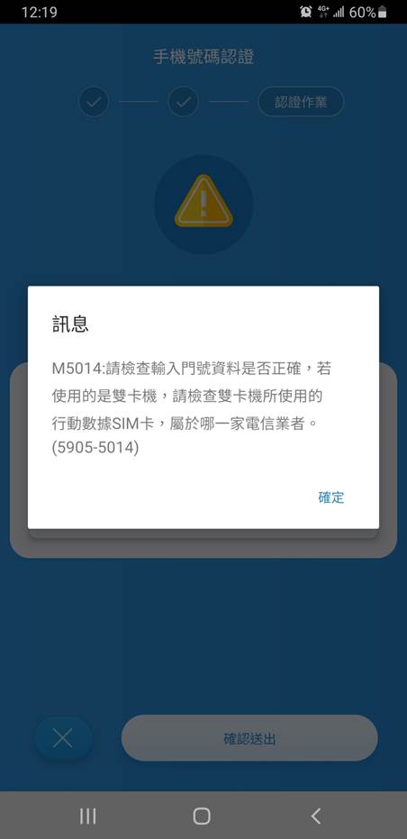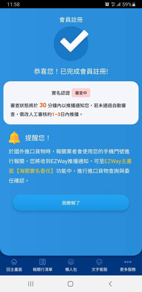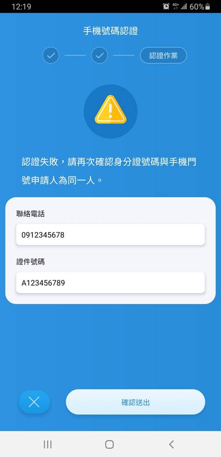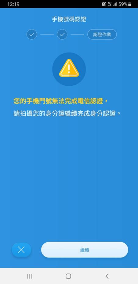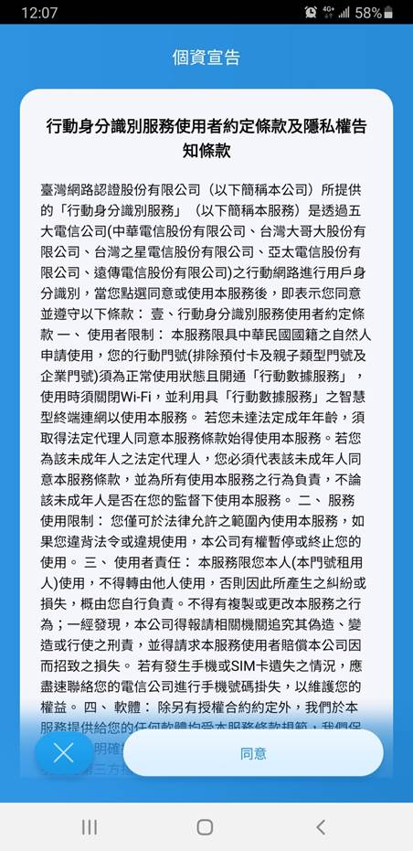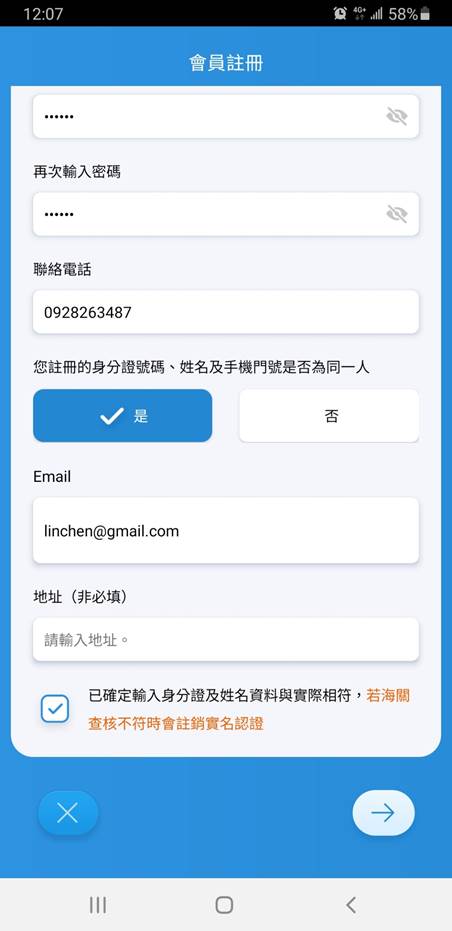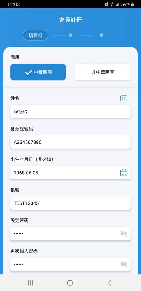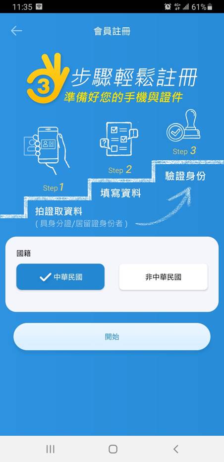 - 在APP上填列國籍、手機門號、姓名及身分證字號,若目前使用之手機門號所有者與欲註冊者相同者,於「輸入的身分證號碼與手機門號申請人為同一個人」選擇「是」,並輸入帳號(自設)、密碼(自設)及電子信箱,確認手機在4G或3G行動網路下(非wifi環境),資料送經電信業者確認身分,審核完成即完成註冊。