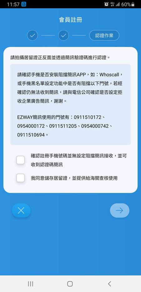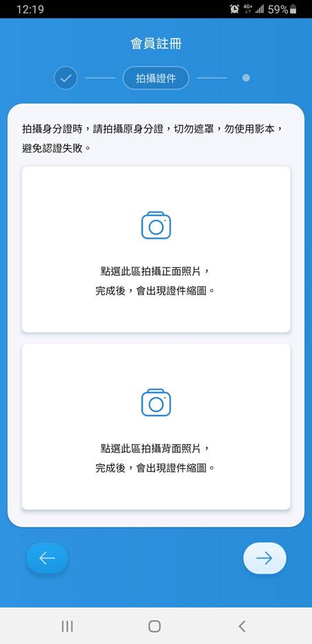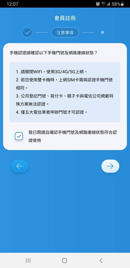 - 在APP上填列國籍、手機門號、姓名及身分證字號,若非目前使用之手機門號所有者、預付卡、特殊資費方案或門號無行動上網功能等,於「輸入的身分證號碼與手機門號申請人為同一個人」選擇「否」,並輸入帳號(自設)、密碼(自設)及電子信箱,上傳身分證正反面照片(清晰照片),影像辨識確認無誤,將發送簡訊驗證碼至欲註冊手機門號,於驗證碼欄位輸入驗證碼,審核完成(約3個工作日)即完成註冊。
